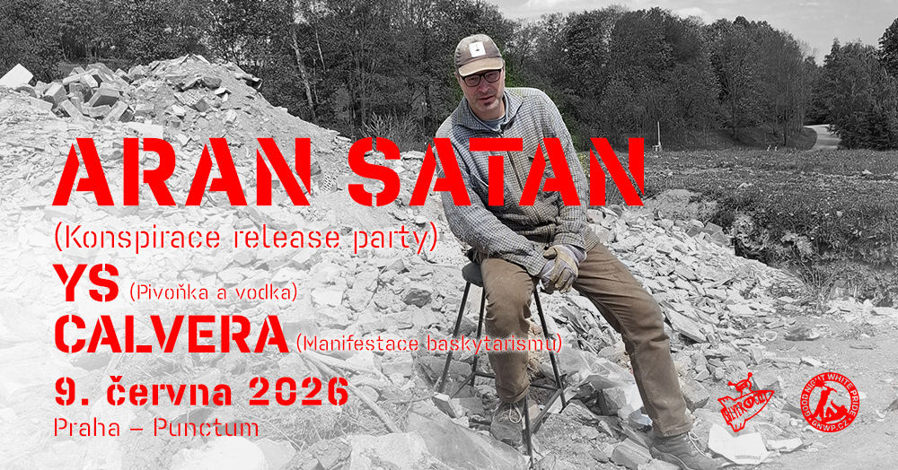 Po debutové kazetě „MVP“ z roku 2018 a 12“ splitu „Stigma“ s Innoxia Corpora (2021) se s třetím fyzickým nosičem hlásí mluvící člověk Aran Satan. Nová kazetová kolekce „Konspirace“ sestává jednak ze singlů, které Aran Satan trousil během roku 2025 na svém Bandcampu (spolupráce se Stevie Brufen, Katastr, Cars and Trains, l´homme approximatif atd.), jednak z čerstvých songů, k nimž dodali hudební podklady třeba Moby (prostřednictvím své volně dostupné „knihovny“ beatů na adrese mobygratis.com), Onry Ozzborn, Bene z Modrých hor nebo Yoz. Zkrátka KONSPIRACE. V úterý 9. června v Punctu pogratulují k úspěšnému porodu Satanovi ještě duo Ys (neboli Pivoňka s vodkou) a baskytarový tvrdohlavec Calvera. A pozor – živá hudba startuje v 19.45!